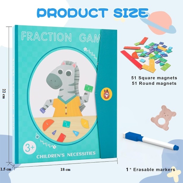 Вклучува 9 шарени магнетни кругови и правоаголници за полесна визуализација и разбирање на дробките.